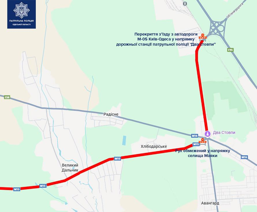 - Рух обмежено на автодорозі М-15 від дорожньої станції патрульної поліції "Два Стовпи" у напрямку Маяків.