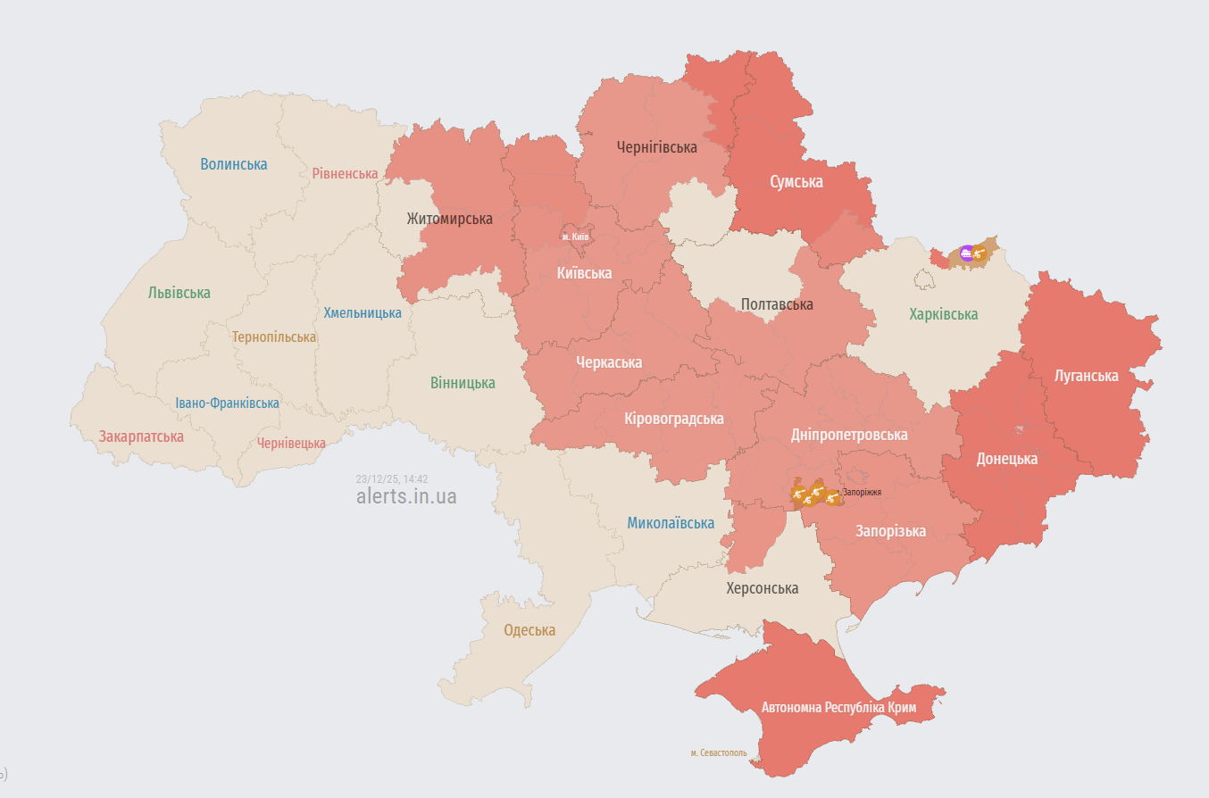 Вдень вівторка, 23 грудня, у Києві, а також низці областей було оголошено сигнал повітряної тривоги.