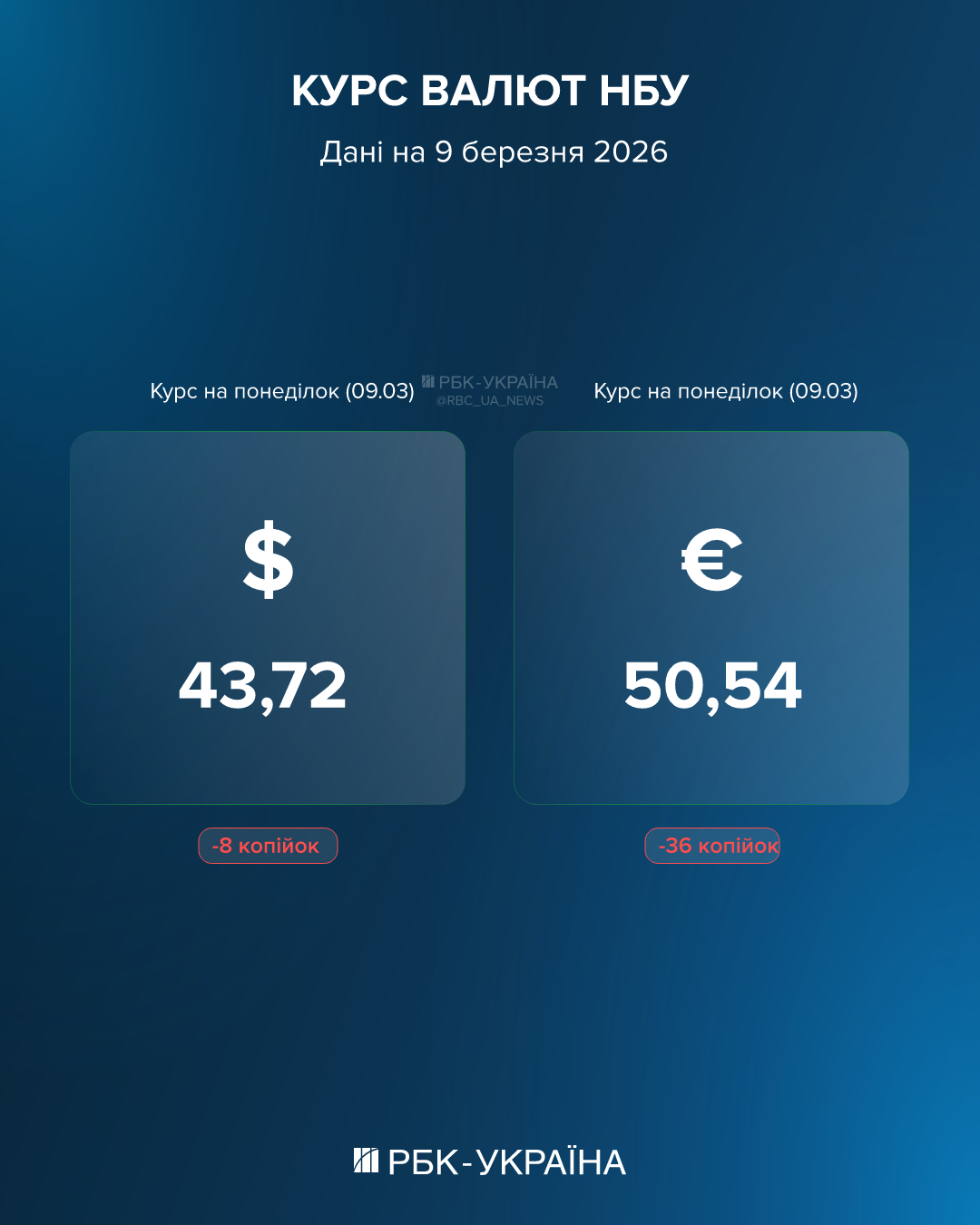 - Курс на 9 березня: Долар зупинив ріст і здешевшав до 43,72 грн (-8 коп.). Євро впав суттєвіше - до 50,54 грн (-36 коп.).
