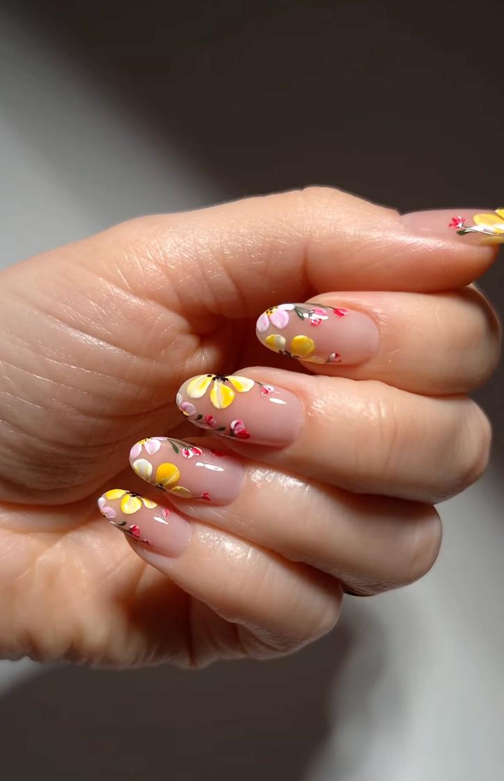 Нюдовий манікюр з жовтими квітами