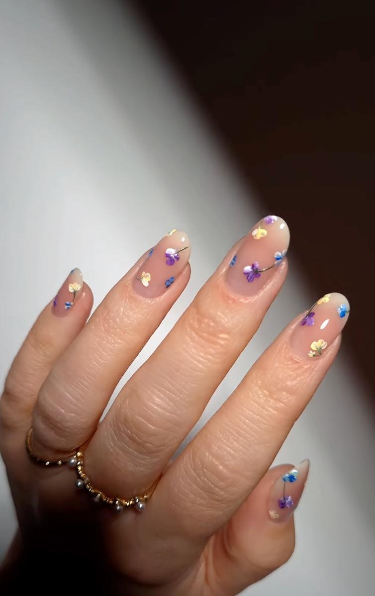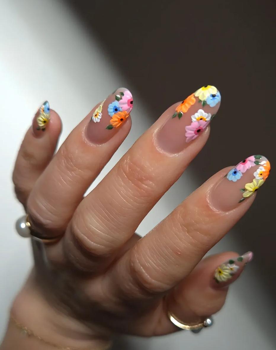 Цей дизайн виглядає як справжній "вибух дофаміну". Маленькі різнокольорові квіти покривають ніготь і створюють ефект легкої хаотичності, яка виглядає дуже гармонійно. Манікюр ідеально підійде для весни і літа, він виглядає свіжо, грайливо і додає образу легкості.