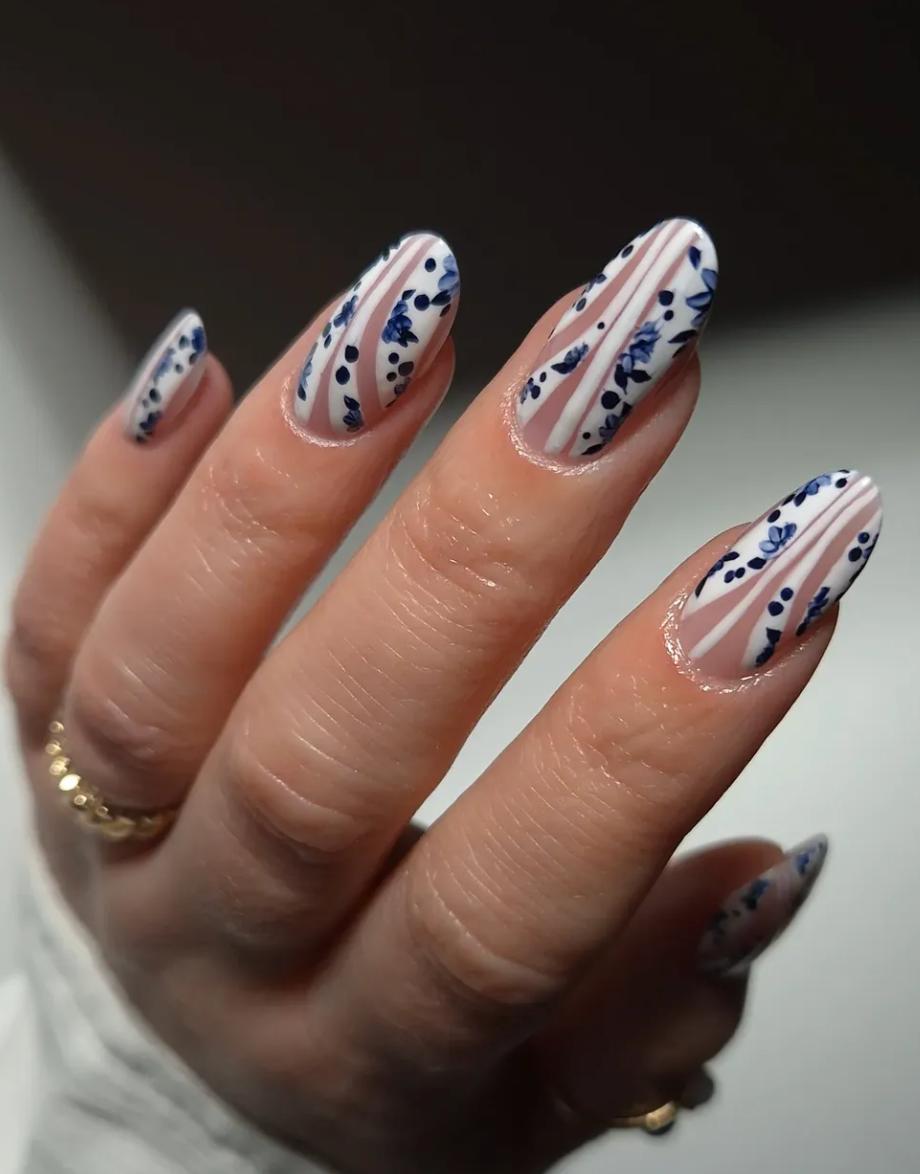 Тут поєднуються чіткі лінії і ніжні квіткові елементи. Світла база, тонкі смужки і дрібні сині квіти створюють дуже стильний і сучасний манікюр. Це варіант для тих, хто любить мінімалізм, але не хоче відмовлятися від весняних мотивів. Дизайн виглядає акуратно, але водночас цікаво.
